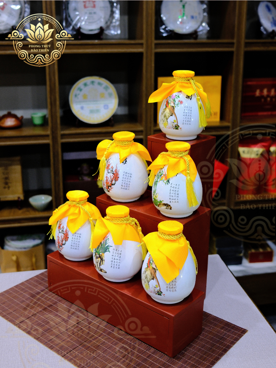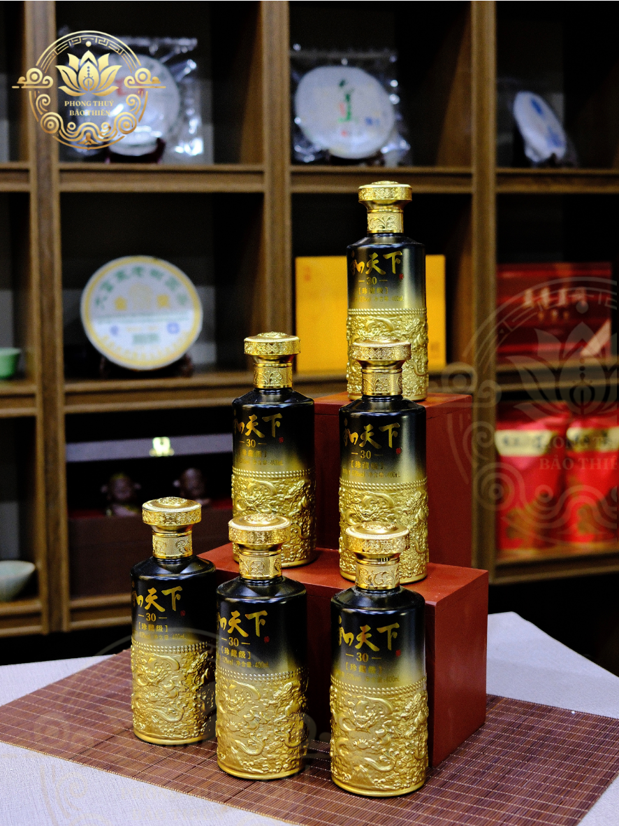 Tạo sự trang trọng và linh thiêng khi đặt rượu trên bàn thờ gia tiên, bàn thờ Thần Tài – Ông Địa, hay trong không gian lễ cúng tại đền phủ.