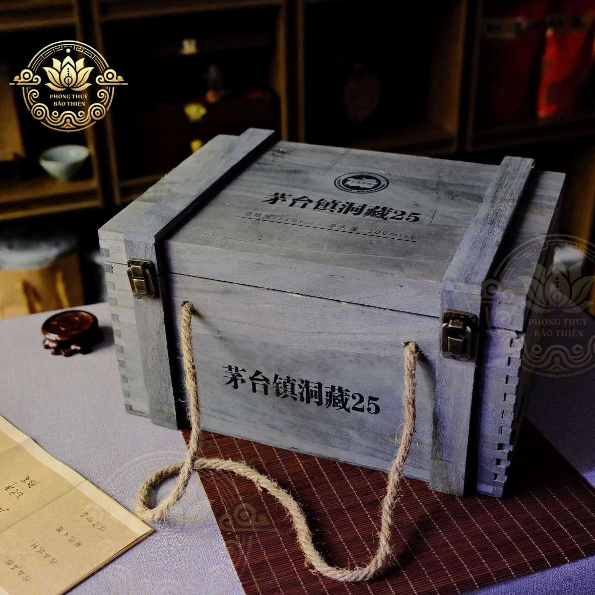 Đóng gói hộp gỗ thô mộc, in chìm tên thương hiệu và số tuổi rượu. Dây thừng xách tạo cảm giác hoài cổ, phù hợp làm quà tặng tâm linh hoặc phong thủy.