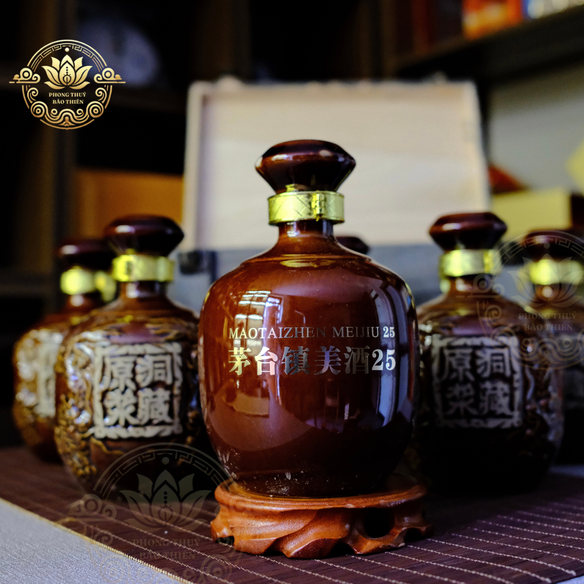 Chữ vàng “茅台镇美酒25” (Maotai Zhen Meijiu 25) trên thân chai gợi sự sang trọng.