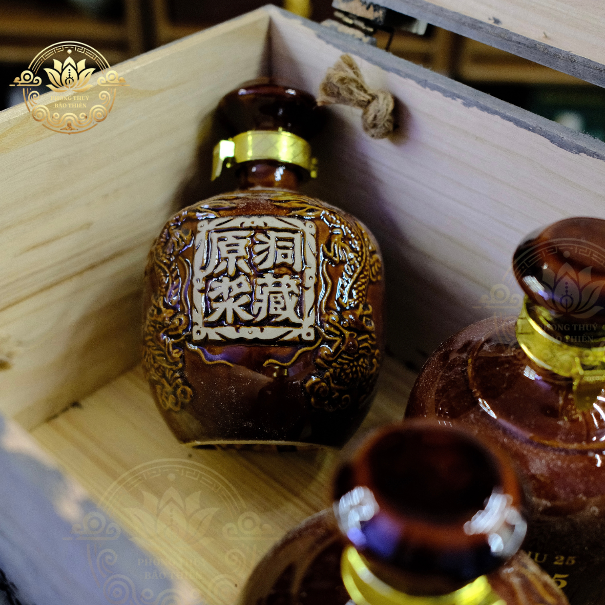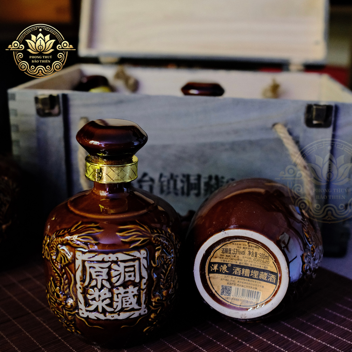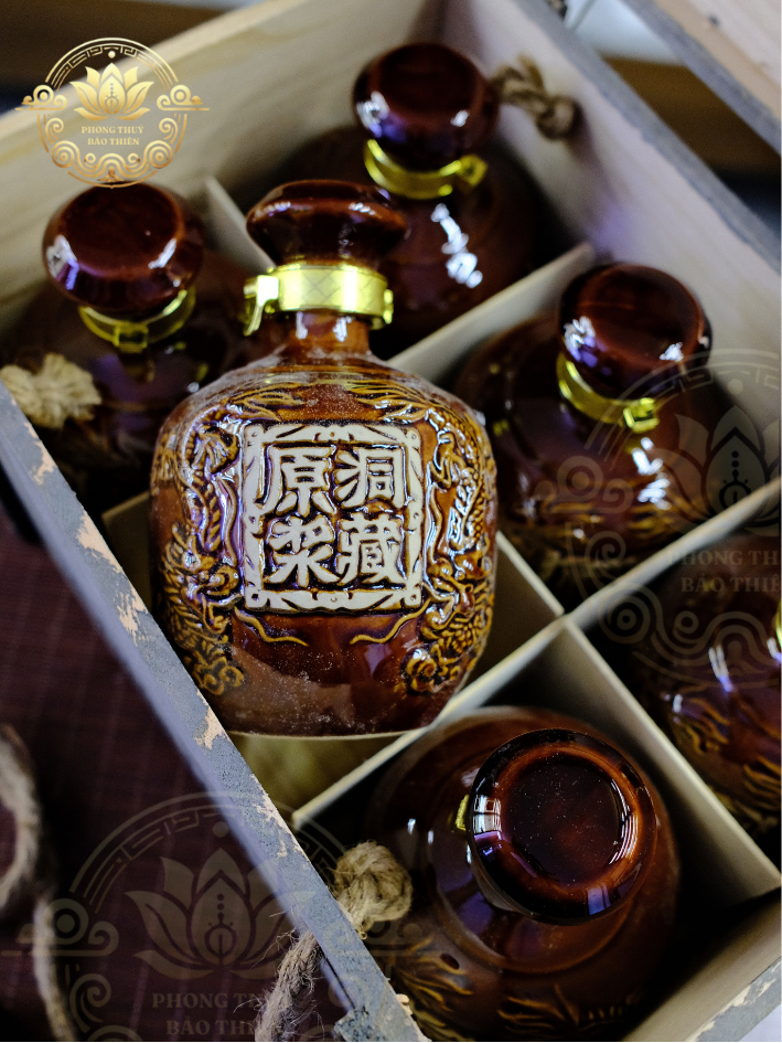 Mỗi chai sứ được đặt hàng riêng với hoa văn rồng và chữ nổi “荣藏” – biểu tượng của cát tường, tích tụ vượng khí – mang đậm yếu tố phong thủy.