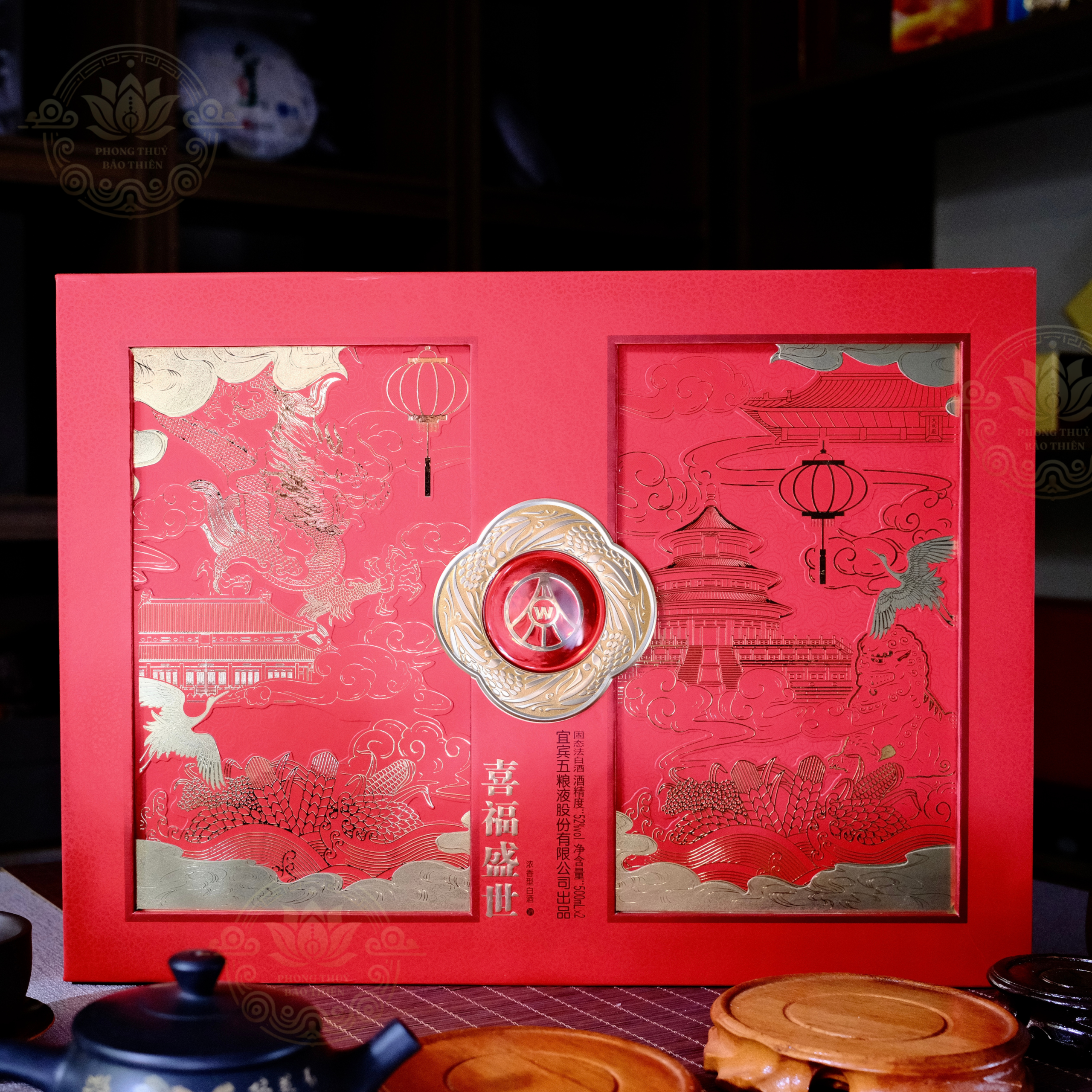 Cụ thể, chất lượng rượu đẳng cấp “Ngũ đại danh tửu” thể hiện sự tôn kính và trân trọng của con cháu đối với tổ tiên, thần linh. Biểu tượng rồng bay uy nghi mang ý nghĩa quyền lực, thịnh vượng hoàn toàn phù hợp với mong cầu tài lộc, may mắn khi dâng lễ Thần Tài. Vỏ hộp đỏ son dát vàng tạo nên vẻ trang trọng, lịch sự cho không gian thờ cúng, thể hiện tính thiêng liêng của nghi lễ.